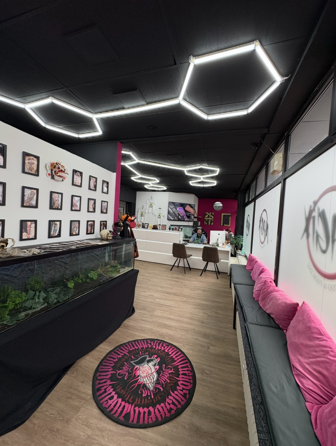 Unsere Räumlichkeiten sind darauf ausgelegt, dir ein angenehmes Erlebnis zu bieten. Wir haben viel Wert darauf gelegt, eine warme und einladende Atmosphäre zu schaffen, in der du dich entspannen kannst. Unsere gemütlichen Sitzbereiche sind ideal, um vor oder nach deinem Termin mit anderen Kunden oder unseren Tätowierern ins Gespräch zu kommen. Wir möchten, dass du dich bei uns wie zu Hause fühlst und die Zeit genießt, die du bei uns verbringst.